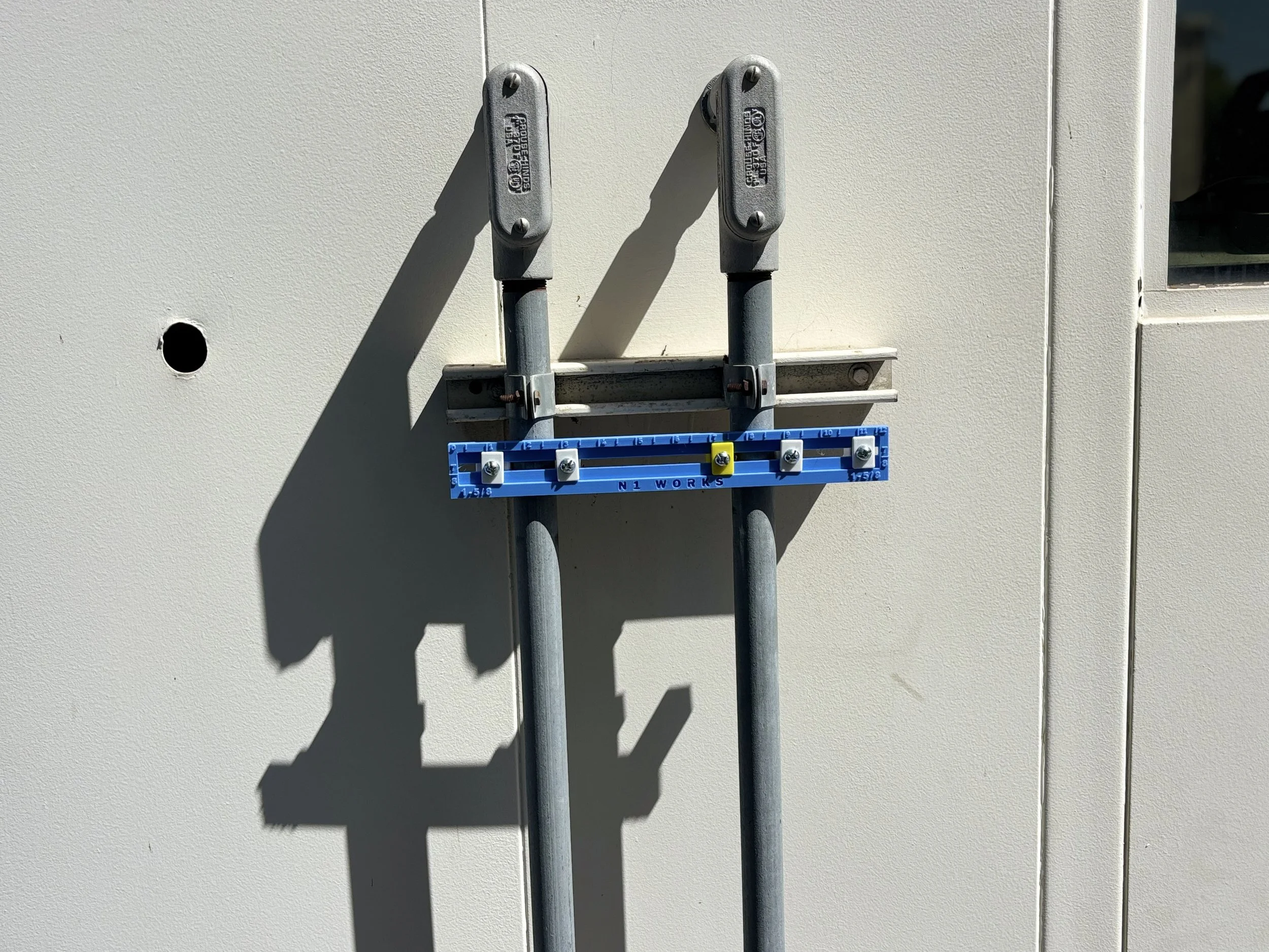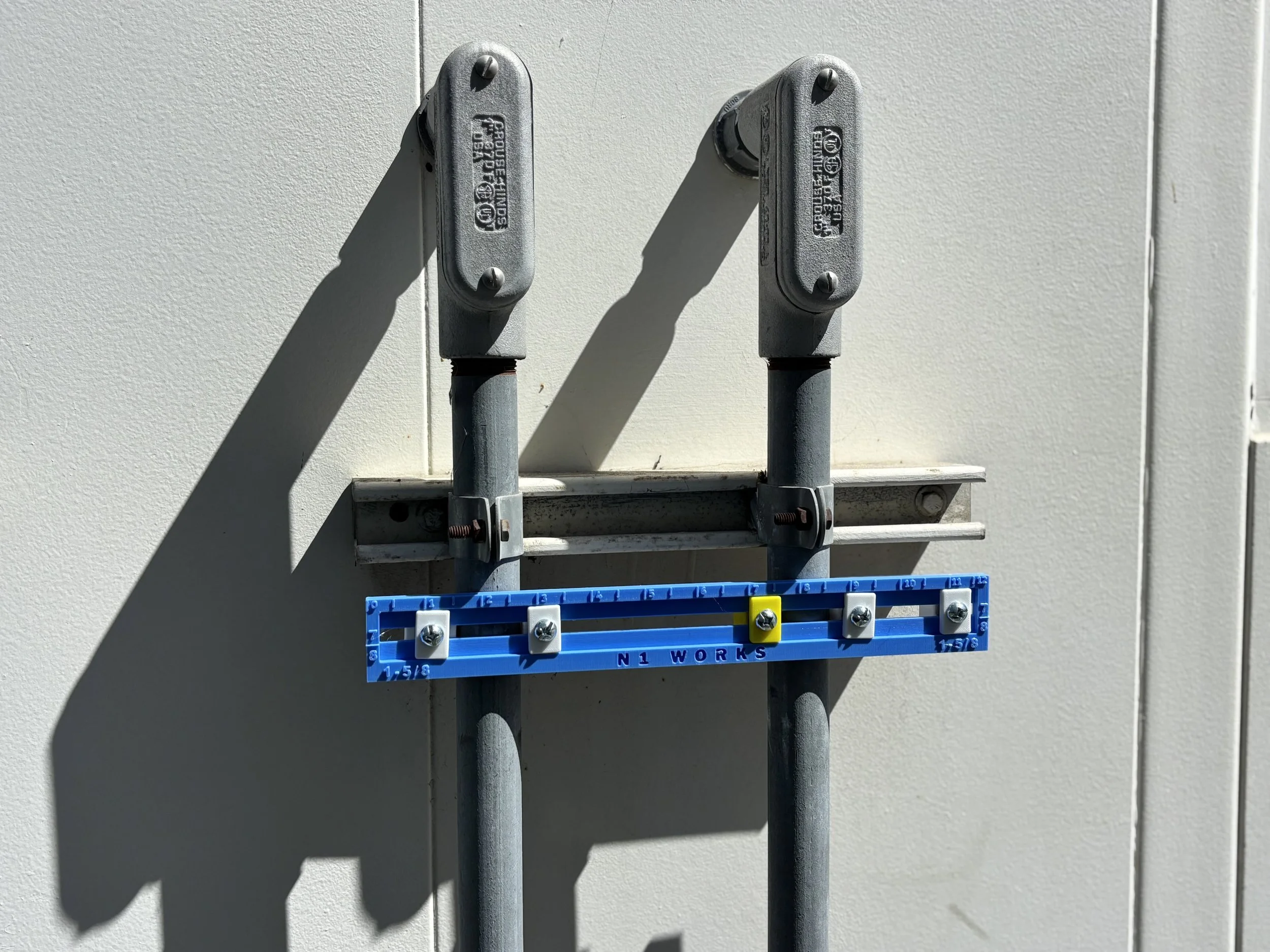 The Can Do-It Spacer is an adjustable, magnetic conduit spacer. The Gaucho model has a blue track and white and yellow blocks. The 12” size is a 12” track with 5 blocks, including an overhead (magnetic) block. There are 4 white blocks and 1 yellow block. The yellow block is the overhead (magnetic) block.