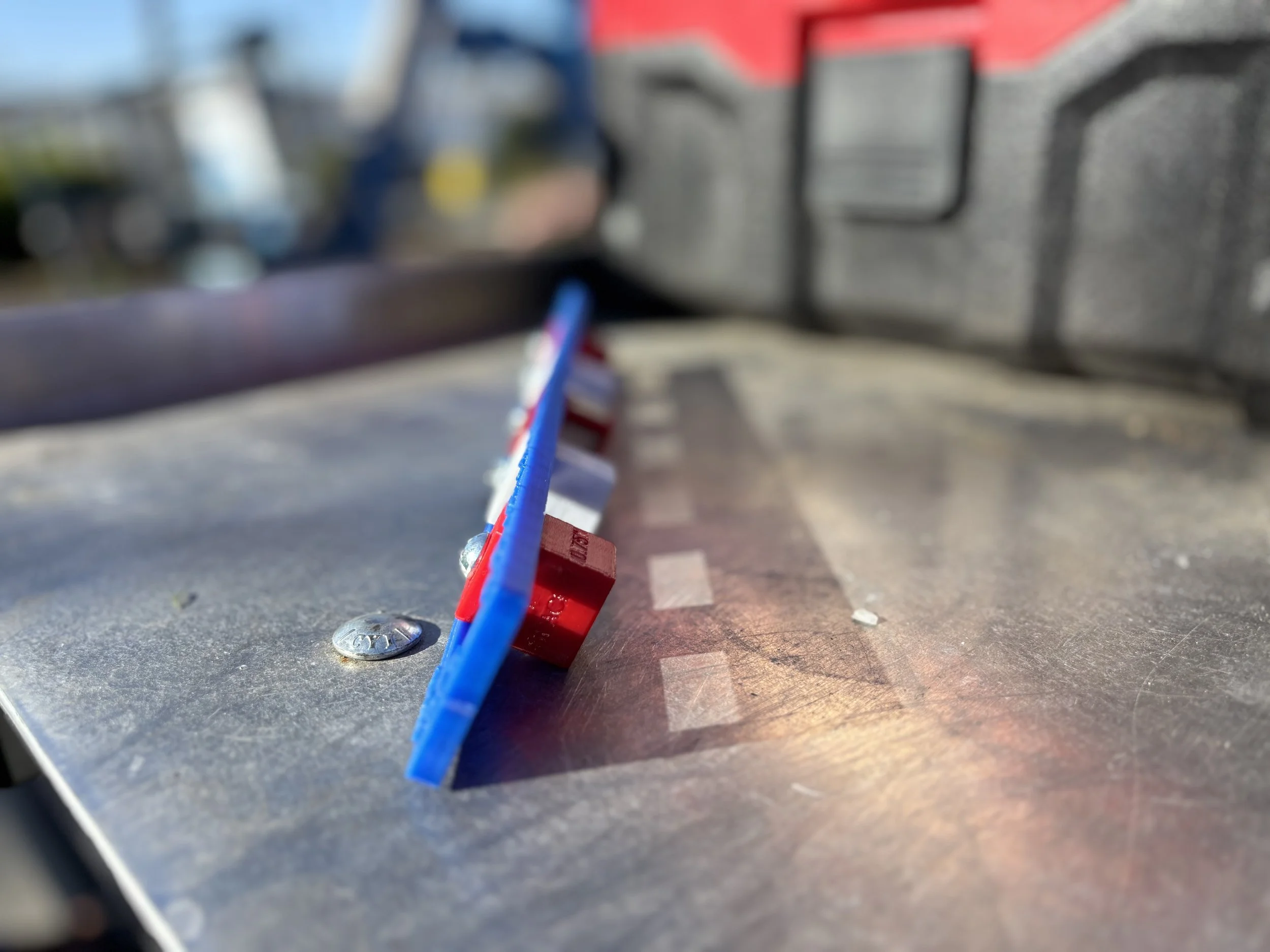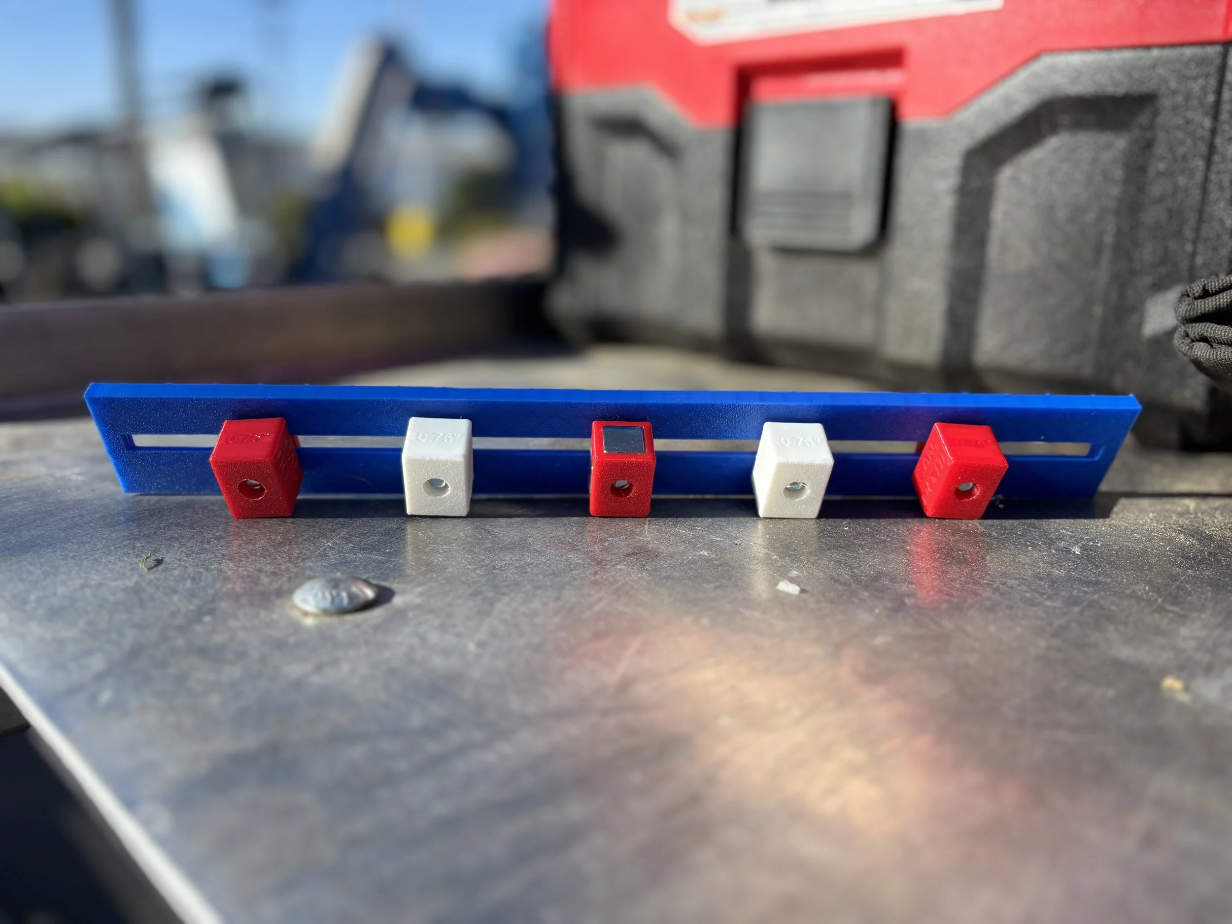 The Can Do-It Spacer is an adjustable, magnetic conduit spacer. The Works model has a blue track and red and white blocks. The 12” size comes with a 12” track and 5 blocks, including an overhead (magnetic) block. The Works model has 2 white blocks and 3 red blocks. The middle red block is magnetic.